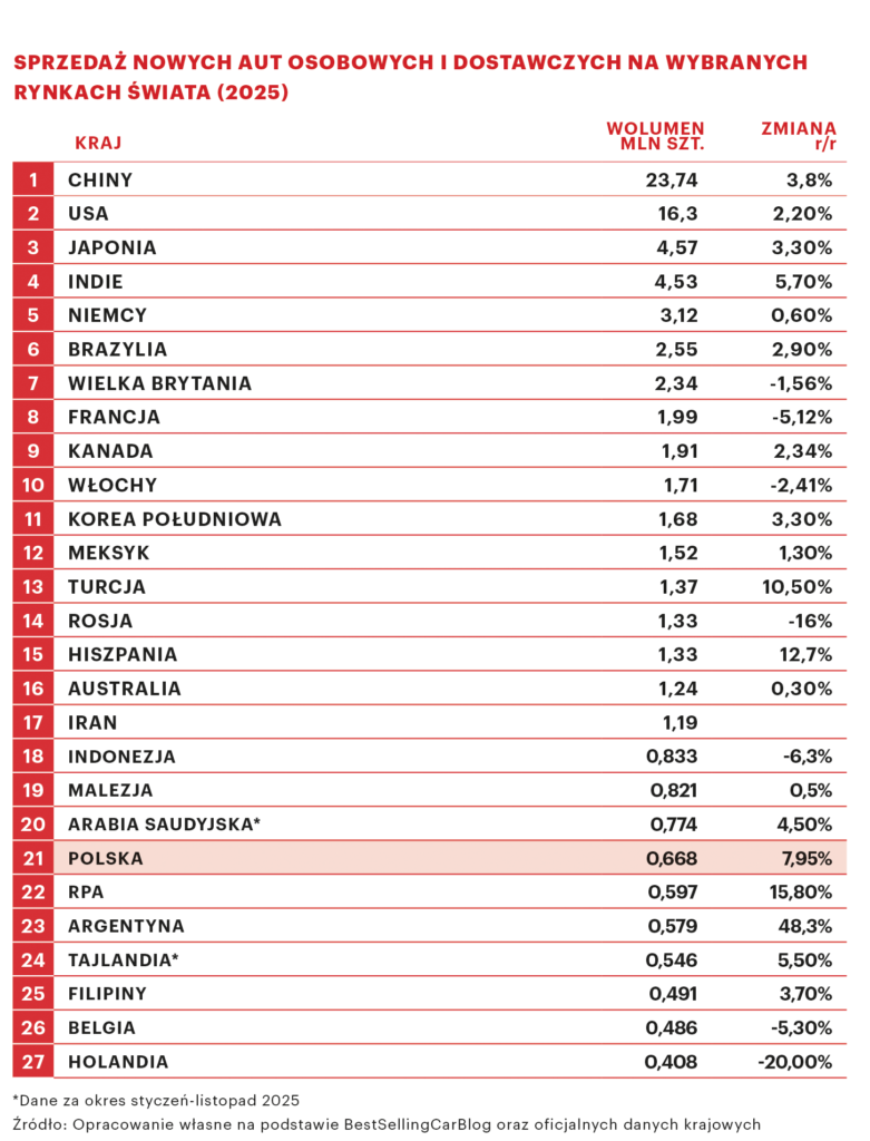Nie sposób oczywiście szczegółowo omówić sytuacji w każdym z krajów, które zakwalifikowały się do TOP20, warto mieć jednak z tyłu głowy, że w ubiegłym roku aż 14 z nich zanotowało wzrost liczby rejestracji nowych samochodów. W rezultacie, według szacunków S&P Global Mobility, w 2025 r. na drogi wyjechało w sumie 91,7 mln lekkich pojazdów, a to oznacza, że branża wróciła do wolumenów sprzed pandemii, po raz pierwszy od sześciu lat notując sprzedaż wyższą niż w 2019 r. (89,9 mln szt.).